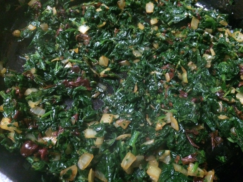 Add spinach and continue cooking until spinach is soft. Season lightly (depending on how salty your feta is). Remove from heat and set aside.