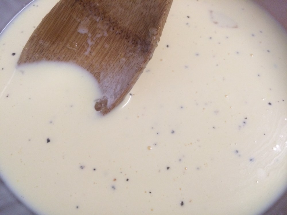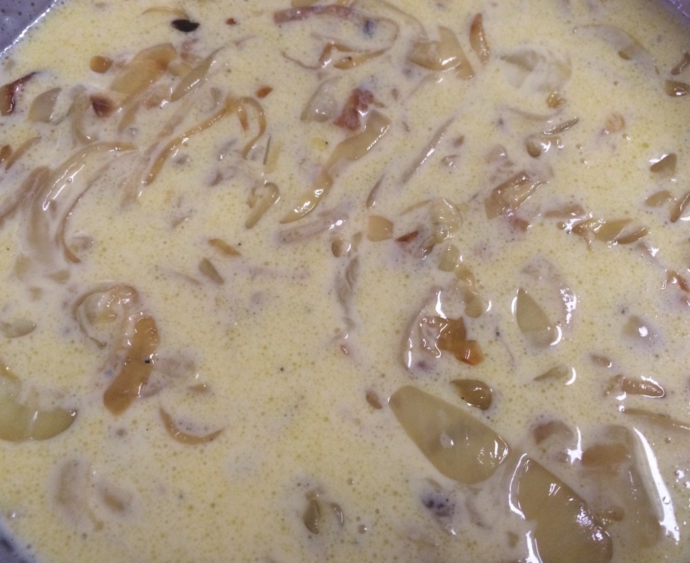 In a large bowl, mix the eggs, cream, milk, salt and pepper.