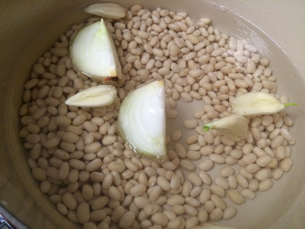 Transfer drained beans to a large, heavy flameproof casserole or Dutch oven. Add 6 cups water, onion and crushed garlic cloves, and bring to a gentle boil over medium-high heat. Cover and reduce heat to low. Simmer 45 minutes. Using tongs, remove onion and garlic cloves and discard.