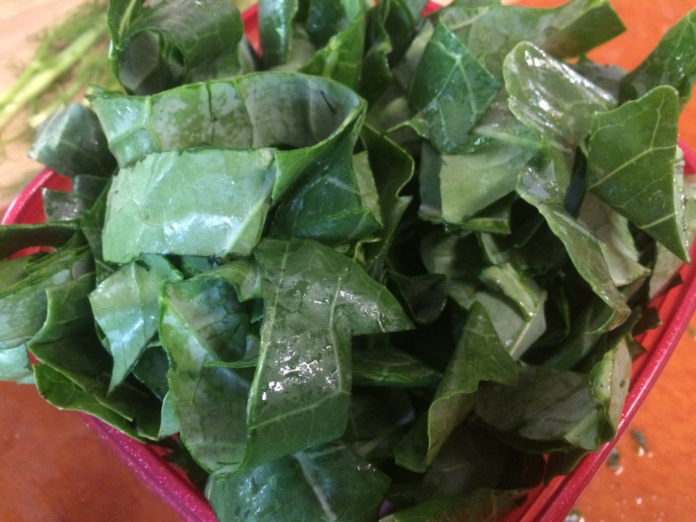 The beautiful greens in here are collard greens from my garden. They survived the groundhog and are growing strong.