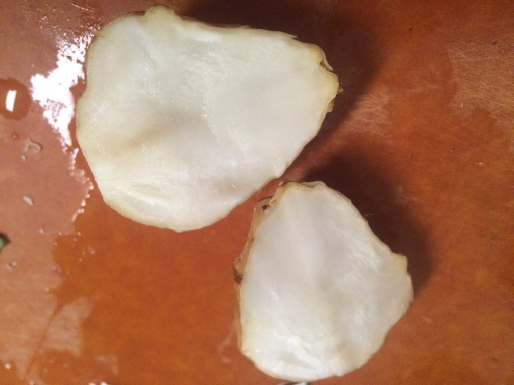 Remove the Jerusalem artichokes from the water. Trim any rough spots and cut each in half lengthwise.