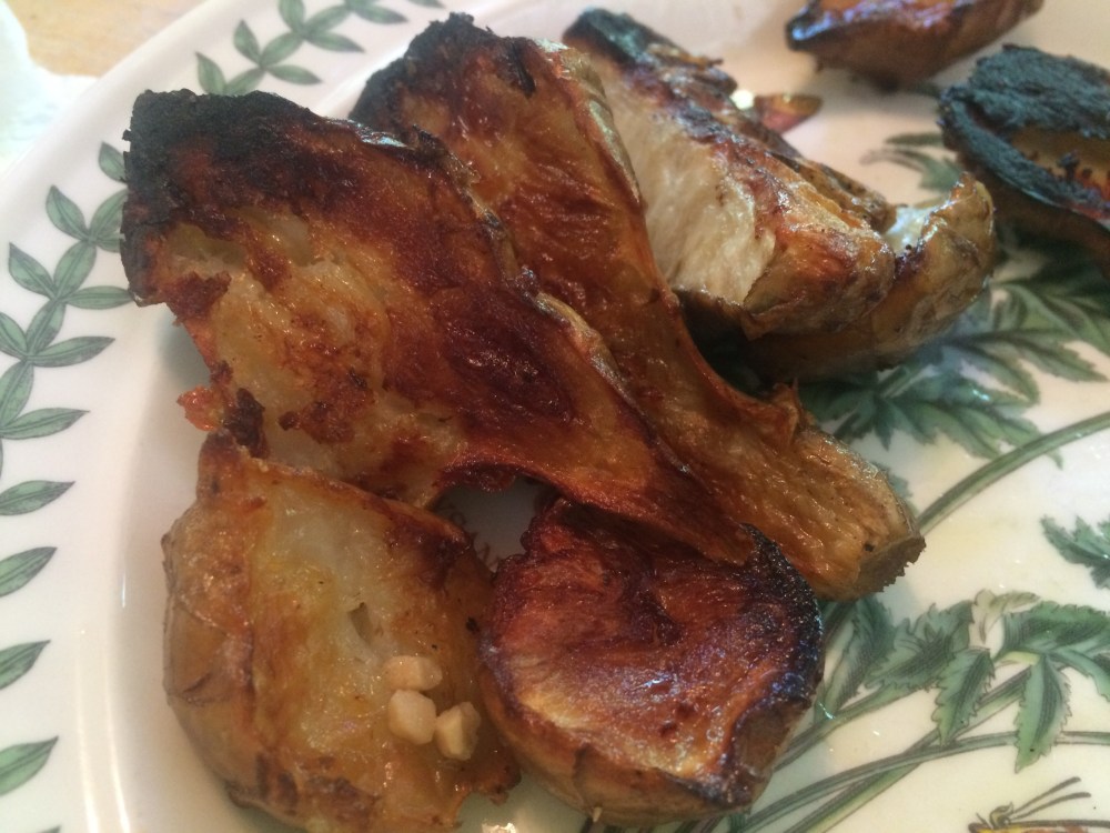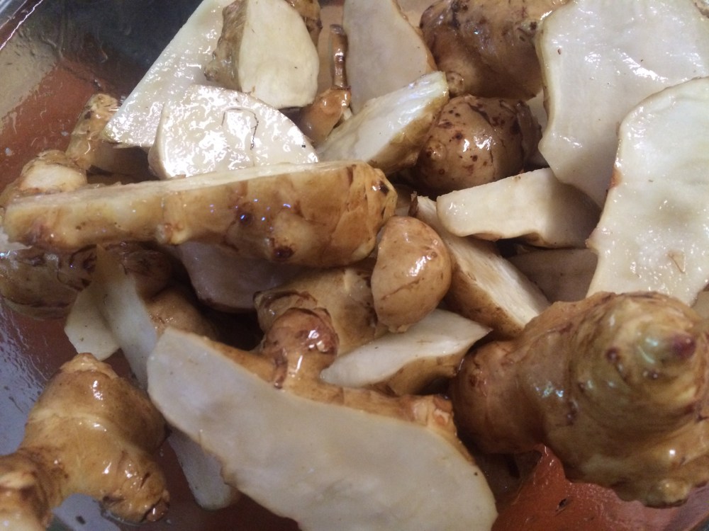 I have roasted the Jerusalem artichokes several ways, but the approach here was a new one that I am very pleased with. Before roasting, the Jerusalem artichokes were soaked in water with lemon juice for 45 minutes to an hour.