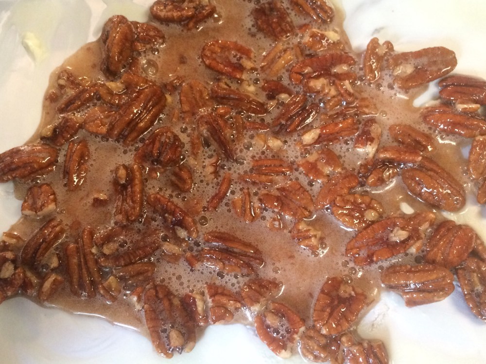 I only had about a cup of pecans, so I scaled the recipe down – it scales fairly easily. I just used 1 egg white instead of 3 and divided everything else by 4. But I have to say, I wish I had more pecans!