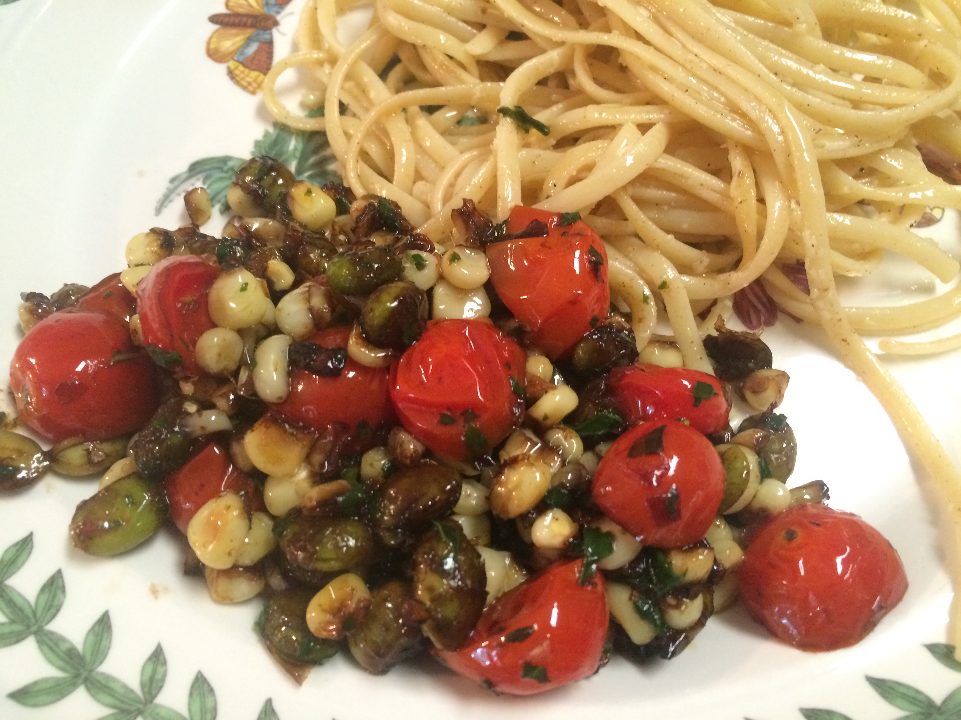 Corn, Edamame & Tomatoes with Pasta and Basil Oil