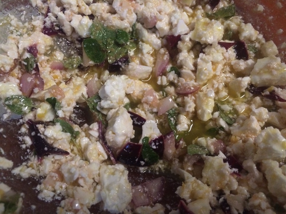 Combine the feta, oregano, garlic and onions in a separate bowl. Add the lemon juice and zest and whisk in the olive oil.