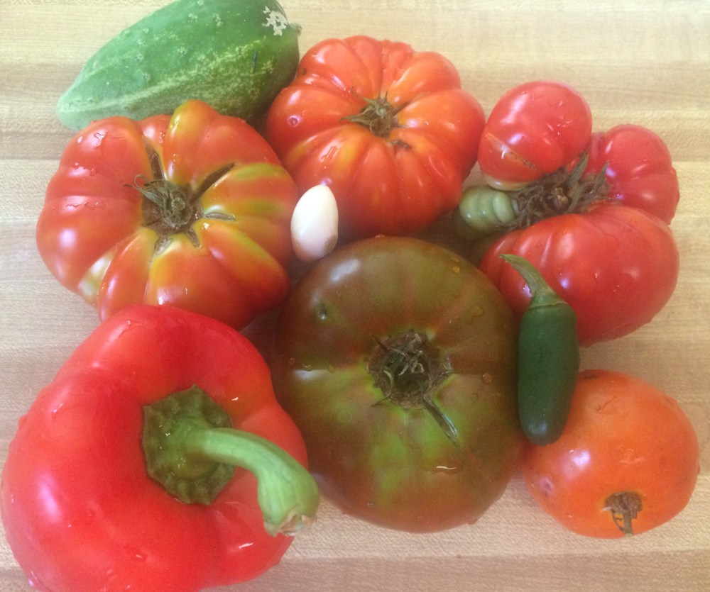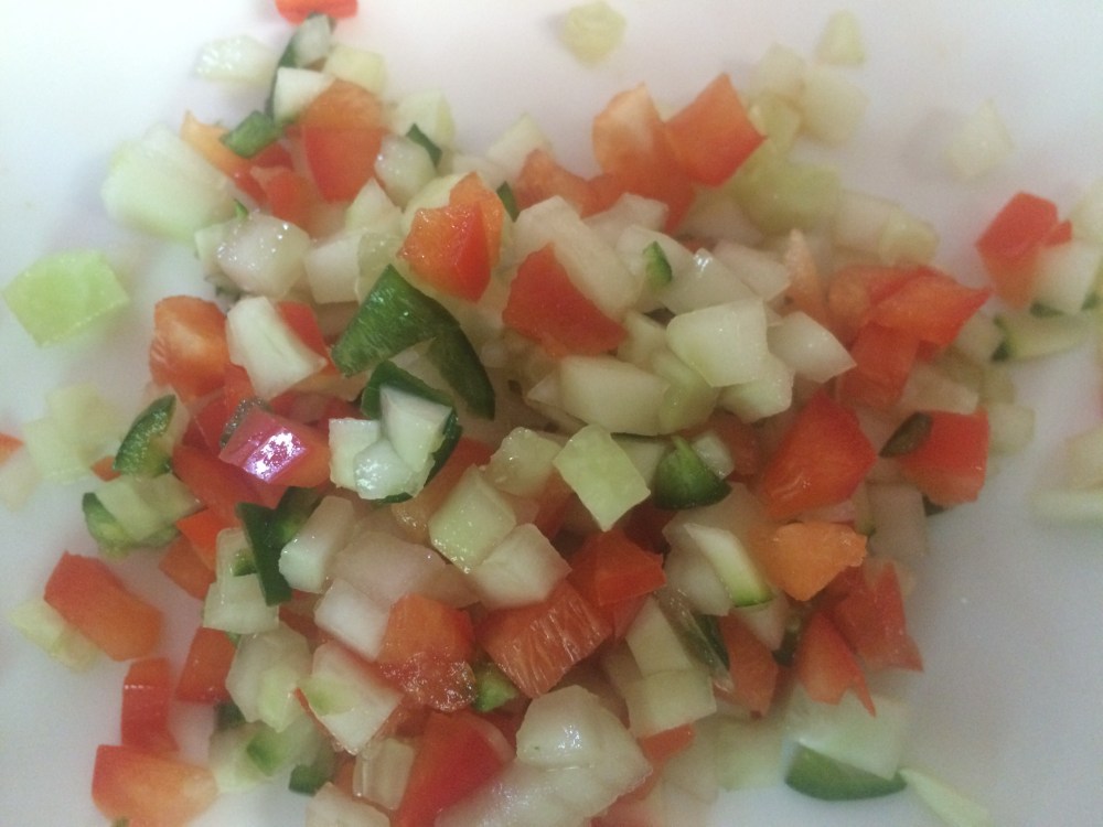 Set aside a little (1 – 2 ounces) of the cucumber, green pepper and red pepper and dice them very finely to garnish the gazpacho.