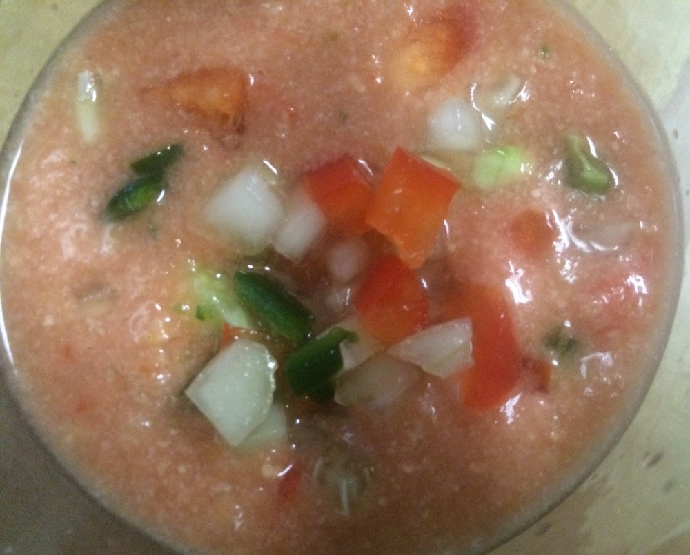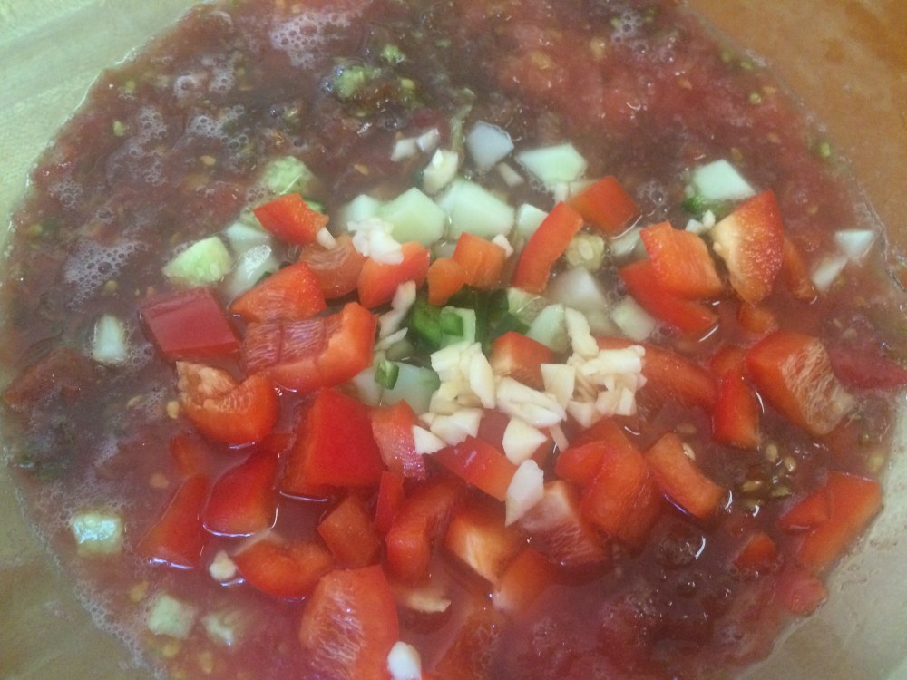 In a bowl, mix all the vegetables together and pour the soaked bread in and blend while adding olive oil to emulsify.