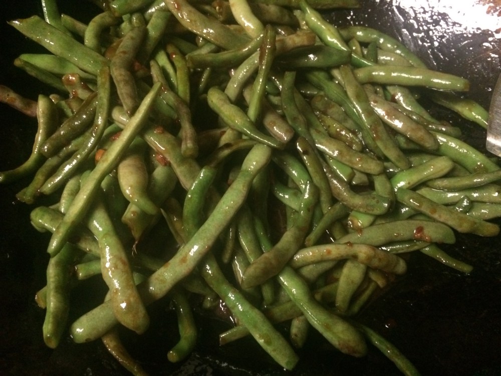 Add 1 Tbsp oil to a wok and heat over high heat. Add the green beans and stir fry till cooked through and tender, about 10 minutes. (Note: if you want to speed up the process, first steam the beans for 1 – 2 minutes in the microwave, then stir fry).