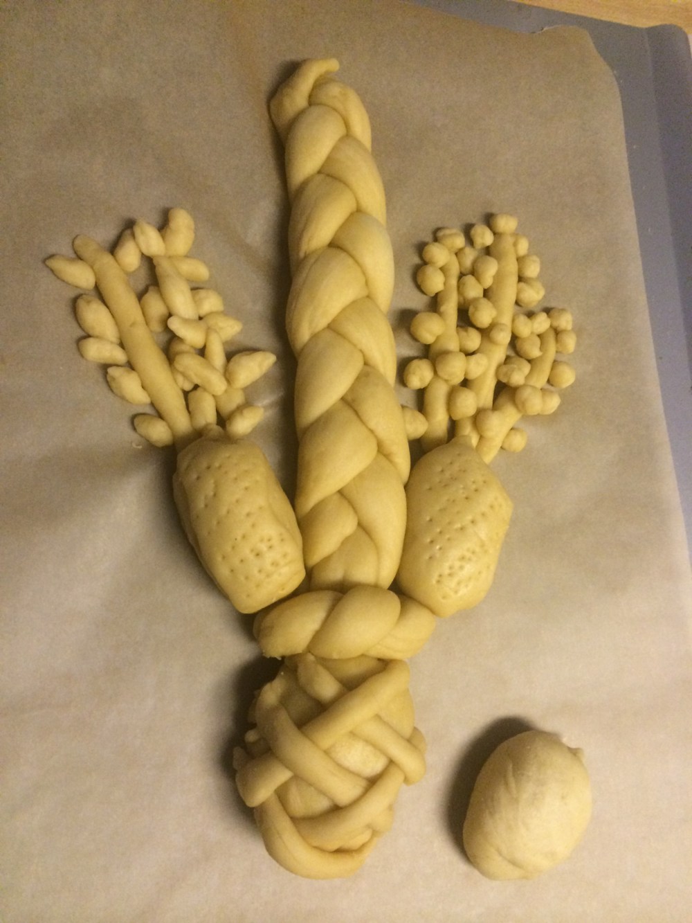 My cousin shared a picture of an amazing challah with me, a challah for Sukkot shaped like a lulav and etrog. I took one look and knew I had to try to do it. And I honestly can’t believe how beautiful it turned out!