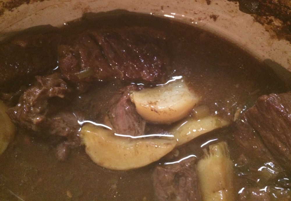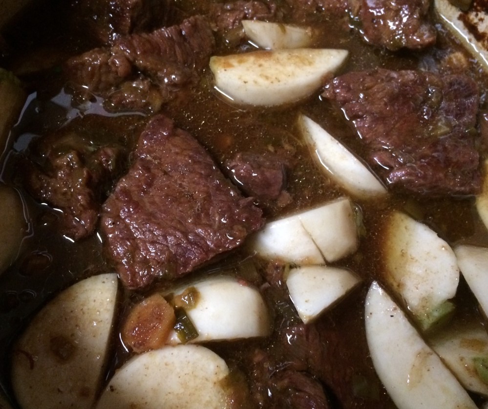 Return the onion mixture and the meat with any accumulated juices on the baking sheet to the pot. Add the stock and soy sauce and bring to a boil over medium high heat. Cover with a tight fitting lid, transfer to the oven and braise for 2 hours, stirring the meat once after 1 hour. After 2 hours, add the turnips to the pot, stirring to submerge them in the liquid.