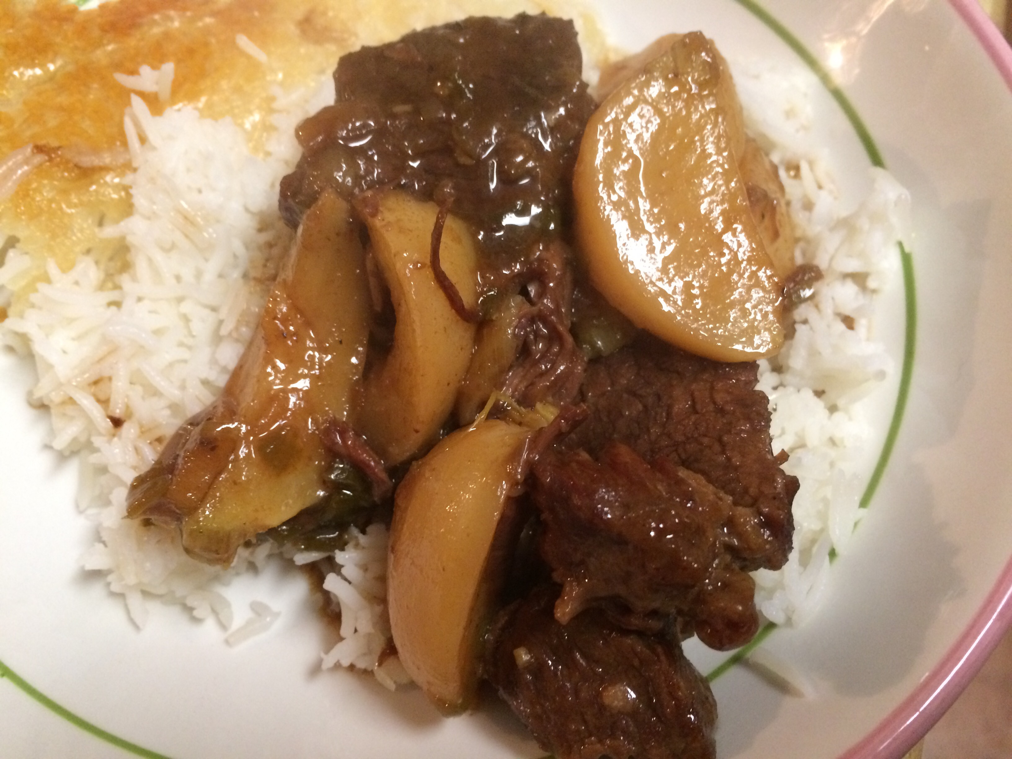 As you can see, I served this with Persian rice – I was outvoted by the overwhelming desire of my “diners” to have tadig – the crispy rice that comes with good Persian rice. But, really this should be served with a sticky rice.