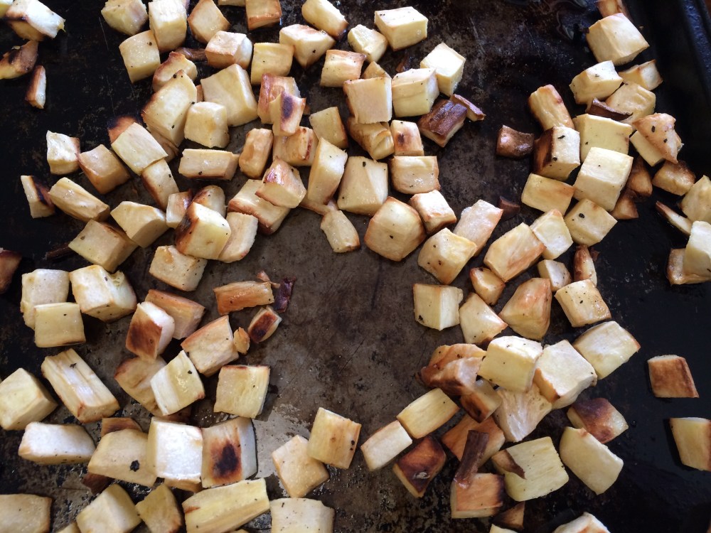 Preheat oven to 425 degrees. Drizzle parsnips with oil, and season with salt and pepper. Arrange on a rimmed baking sheet. Roast, shaking occasionally, until caramelized and tender, 23 to 25 minutes. Let cool. Reduce heat to 375.