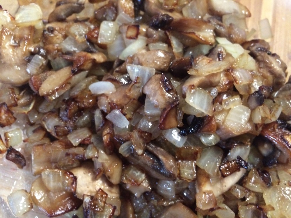 Heat the oil in a large skillet over medium heat. Add the the onion and mushrooms and cook, stirring often, until the onions are soft and the mushrooms are well browned. Remove from the skillet and place in a medium bowl.