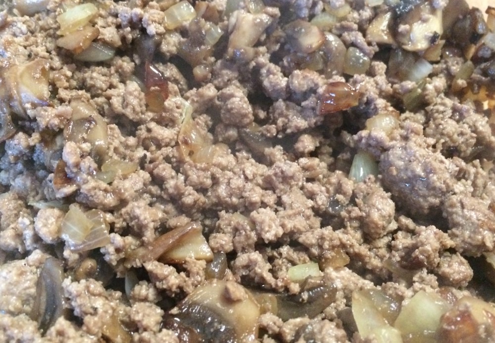 Add the meat to the skillet and cook til browned, breaking up the meat with a wooden spoon. Mix into the onion-mushroom mixture, season with salt and pepper. Let cool.