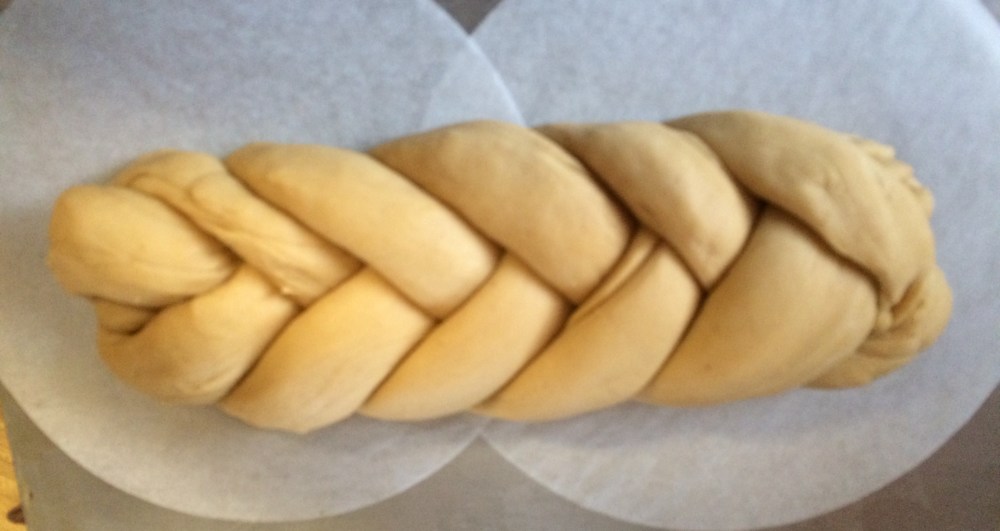 Roll the dough out onto a floured surface and gently knead into a smooth ball. Shape and braid as you like. Place on a baking sheet lined with parchment paper. Let rise a final time for 30 minutes.