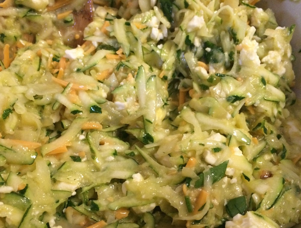 Combine zucchini, onions, eggs, parsley and cheeses. Add salt and pepper to taste. Feta cheese is extremely salty so it may not need any salt at all.