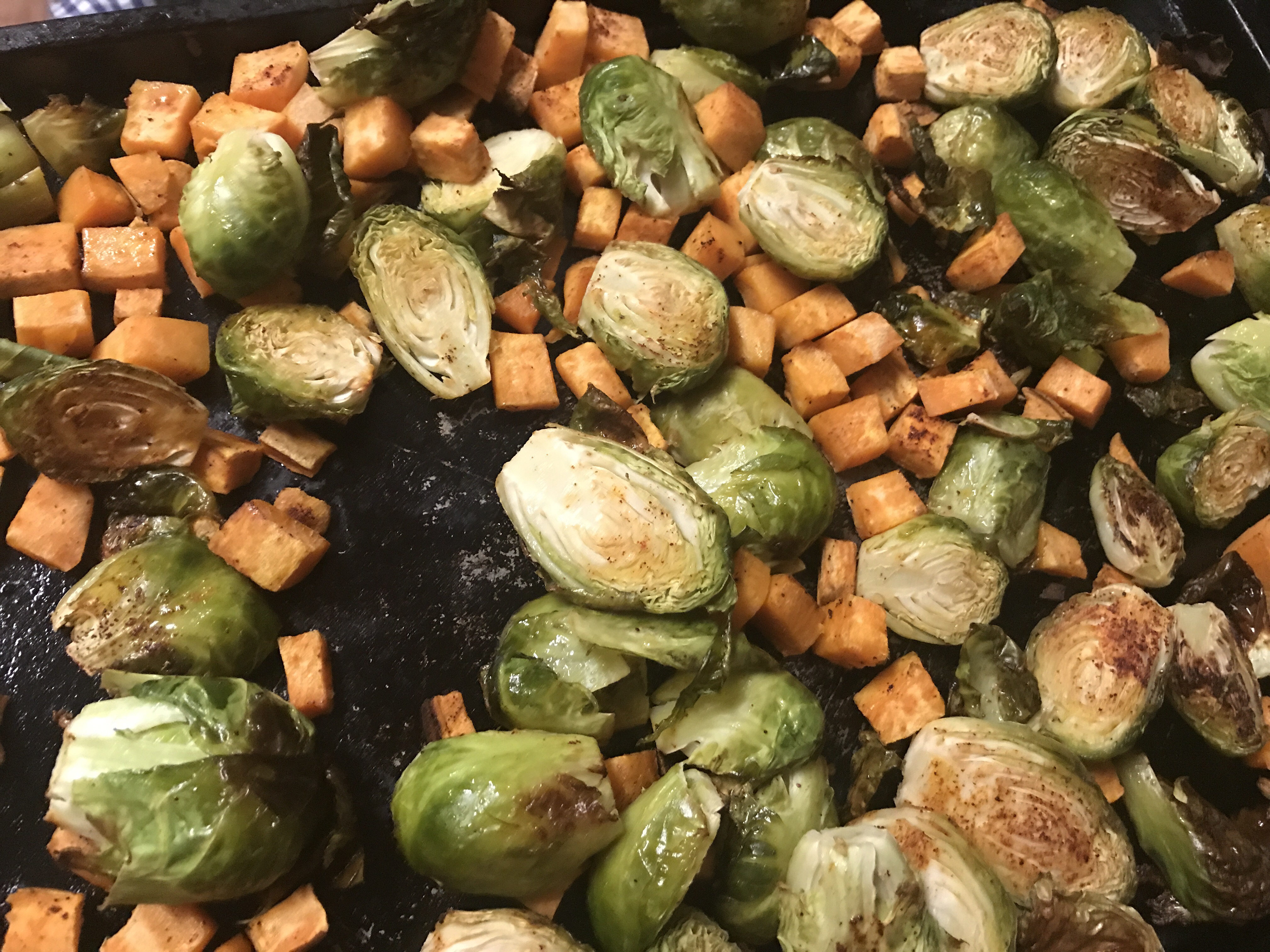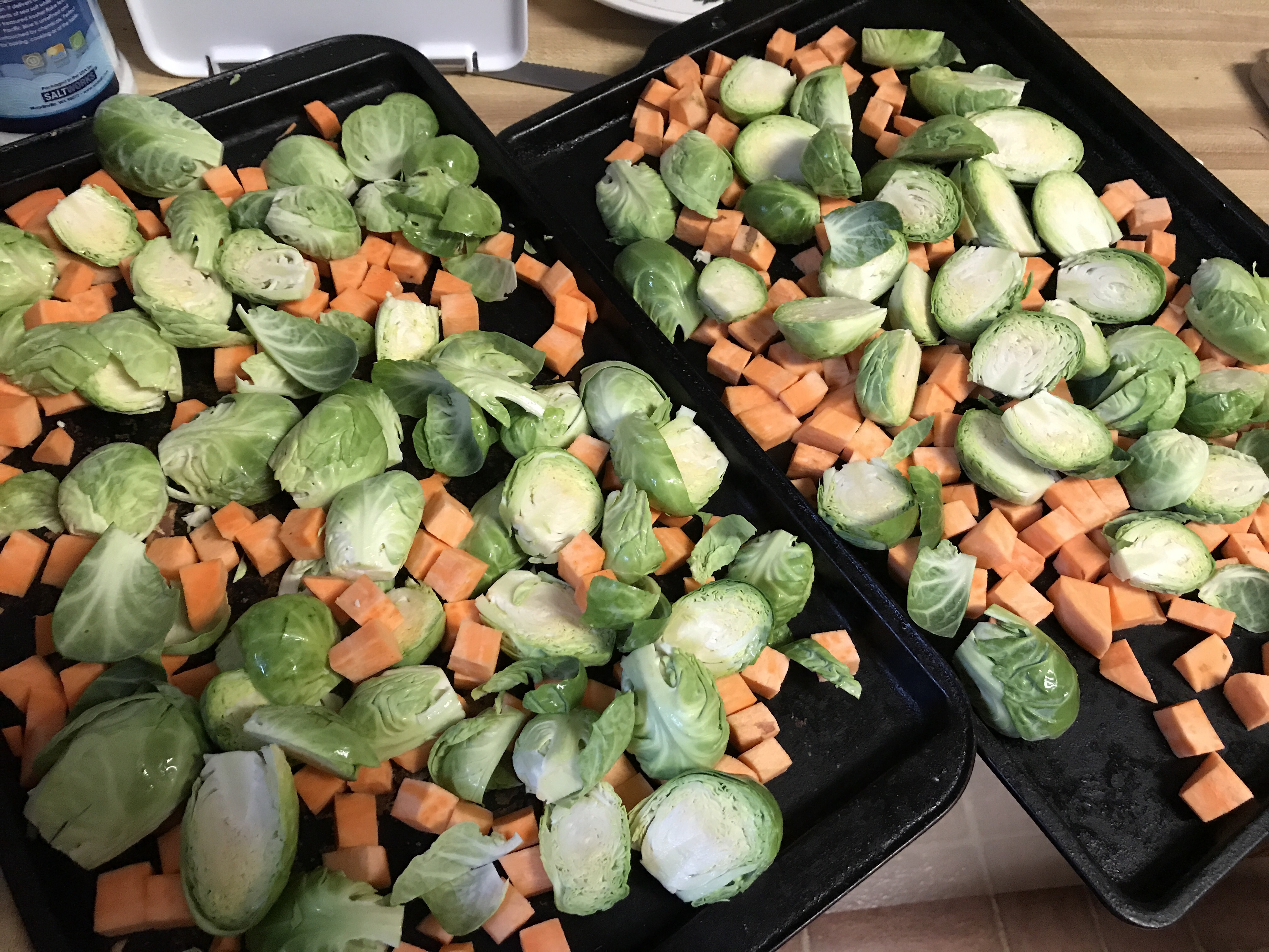 Divide the sweet potatoes and Brussels sprouts between 2 baking sheets.