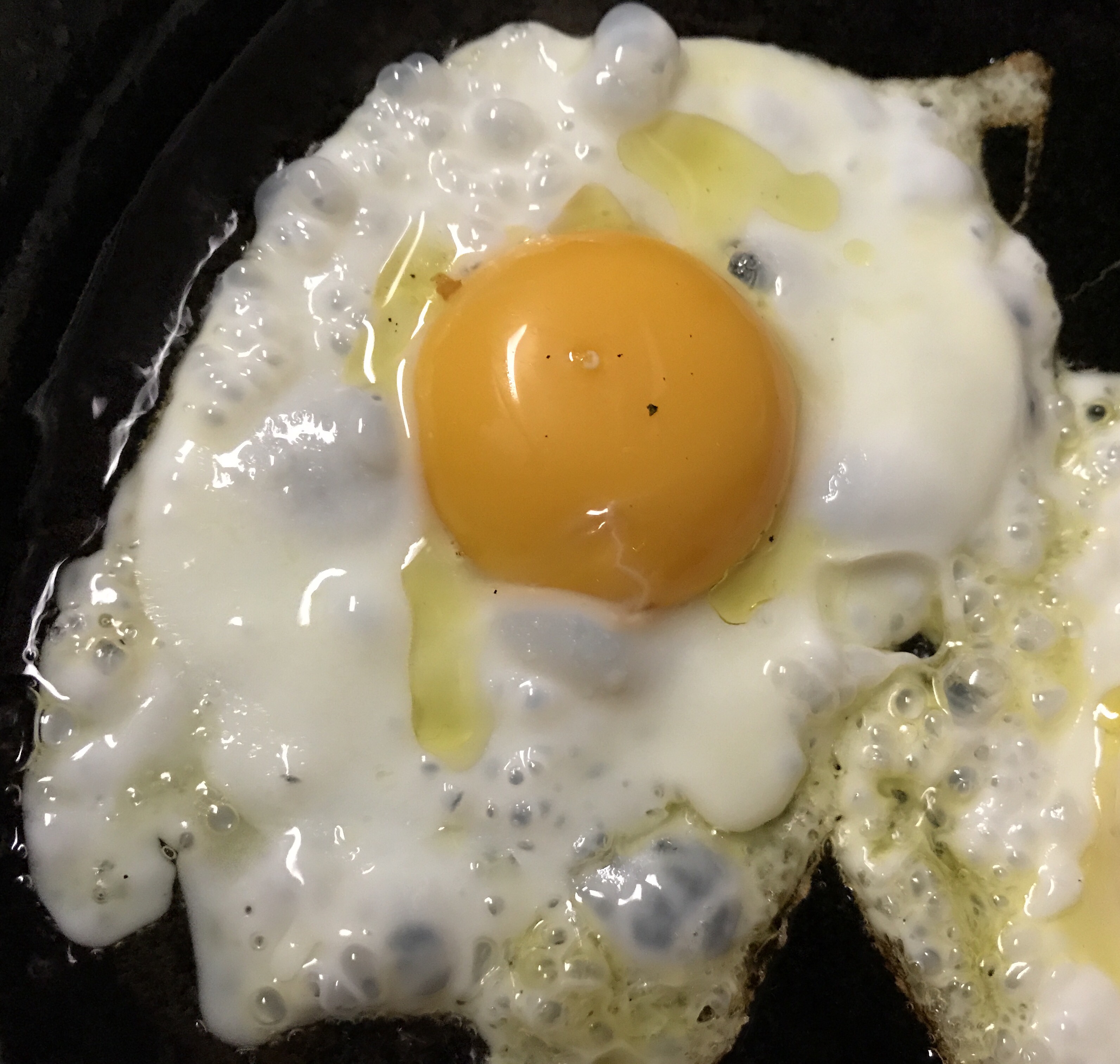 In the last few minutes that the vegetables are roasting, heat 2 Tbsp olive oil in a large skillet (I prefer cast iron) over medium-high heat. Fry the eggs, spooning oil over the yolk for a few minutes til cooked to your preference. You will likely need to fry the eggs in batches.