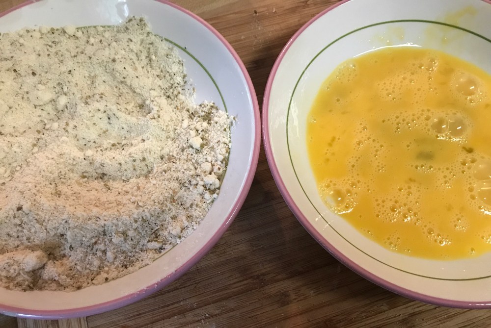 In a flat bowl, combine the almond meal, garlic powder, oregano, salt and pepper.
