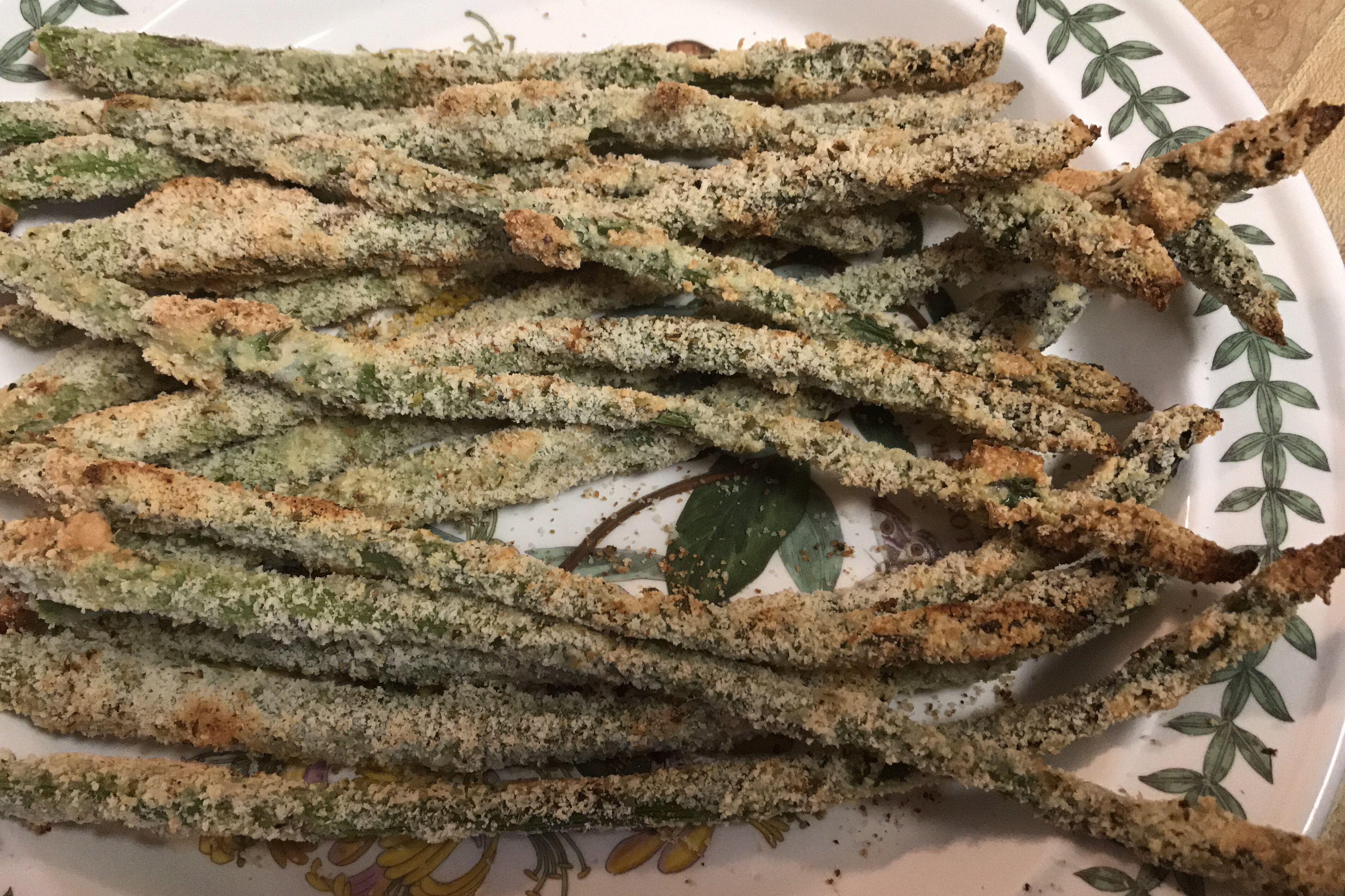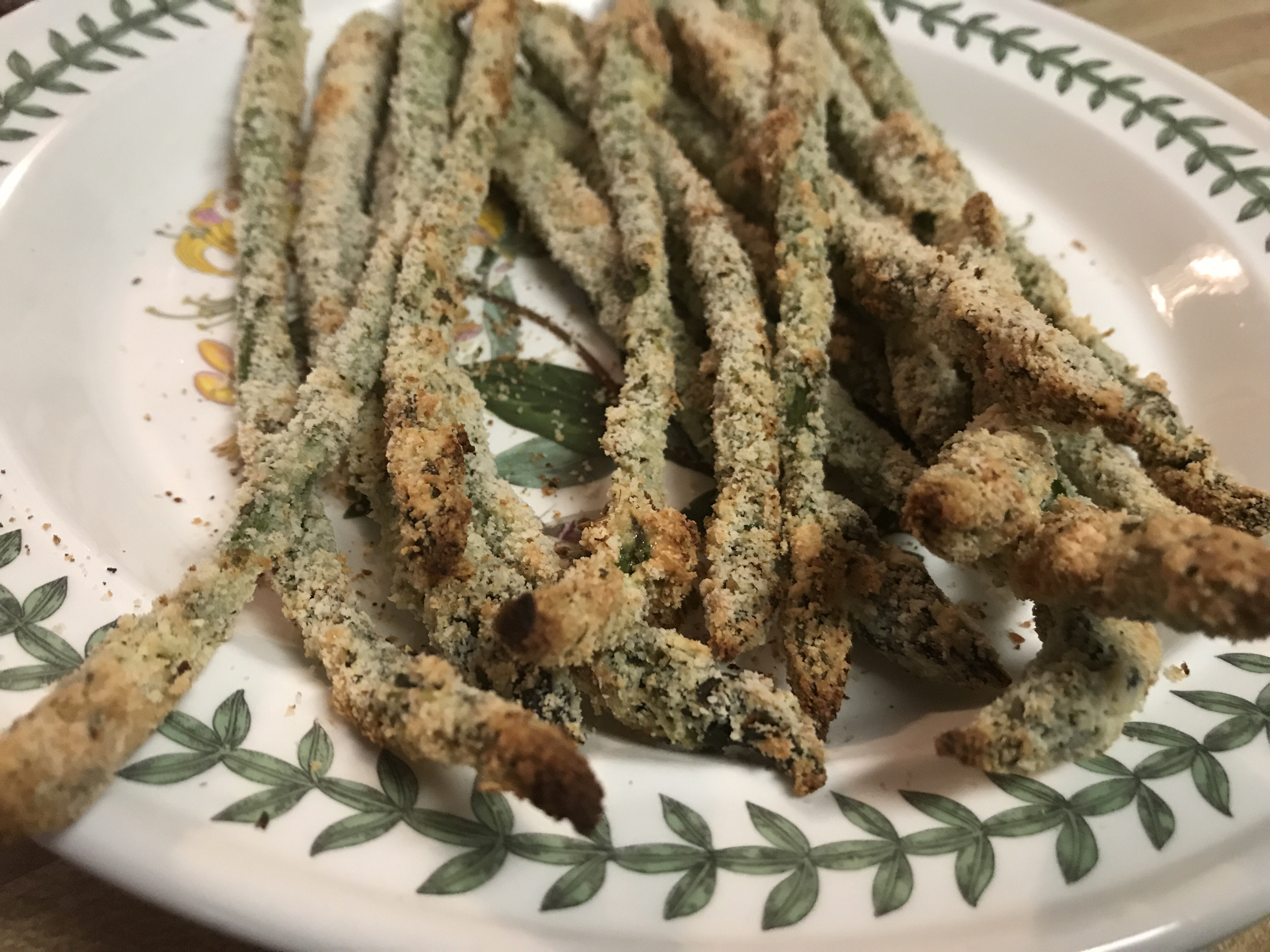 This one is a gluten-free approach to asparagus fries – using almond meal in the coating. Also garlic powder, parmesan and oregano.