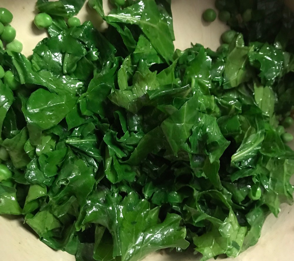 Put the peas and kale in the pot with about a teaspoon of olive oil and cook over medium-high heat tossing, until the kale is wilted and peas are tender.