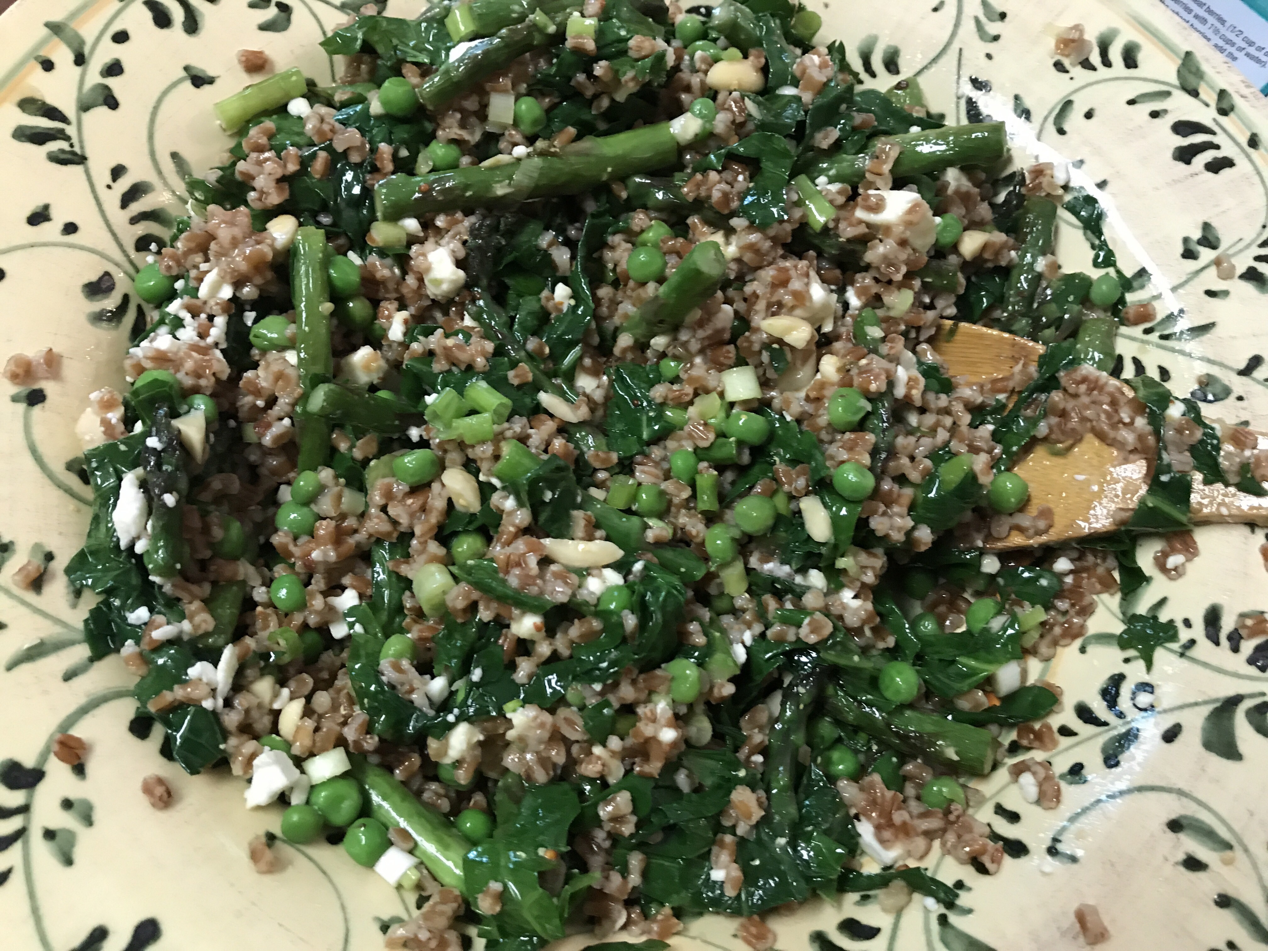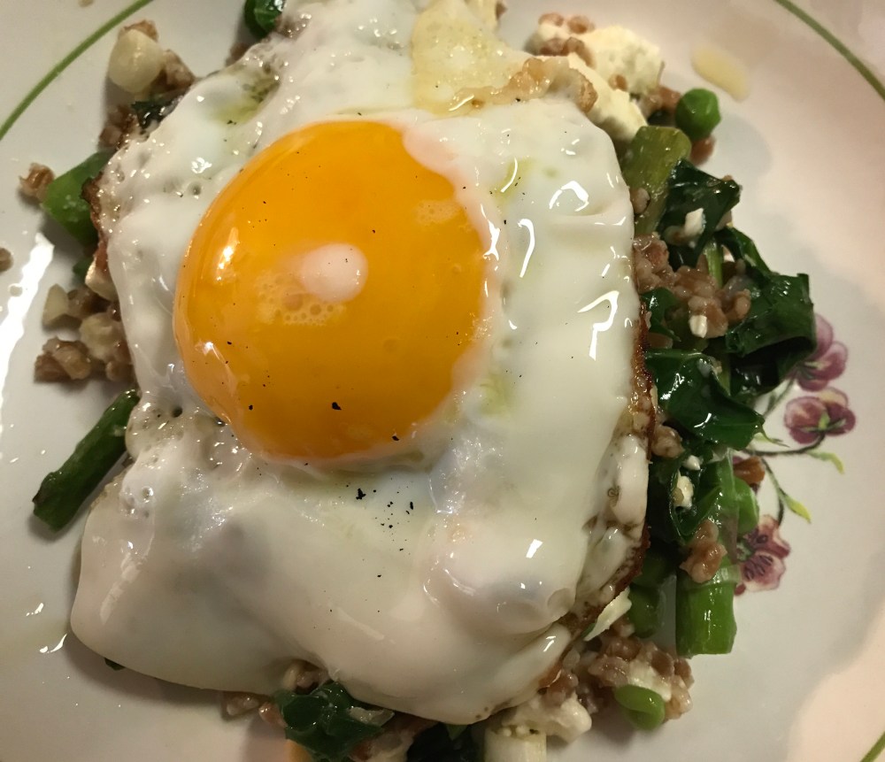 Wheat Berries with Asparagus, Kale, Peas, Feta and Fried Egg.