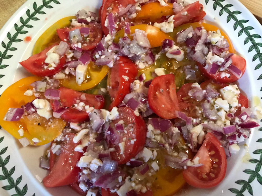 In working my way through the Monday Morning Cooking Club’s It’s always about the food cookbook (yes, the one my recipe is in), I came across this recipe for Heirloom Tomato Salad with Feta Dressing by Michele Wise. How perfect does that sound?! Well, about as perfect as it tastes!