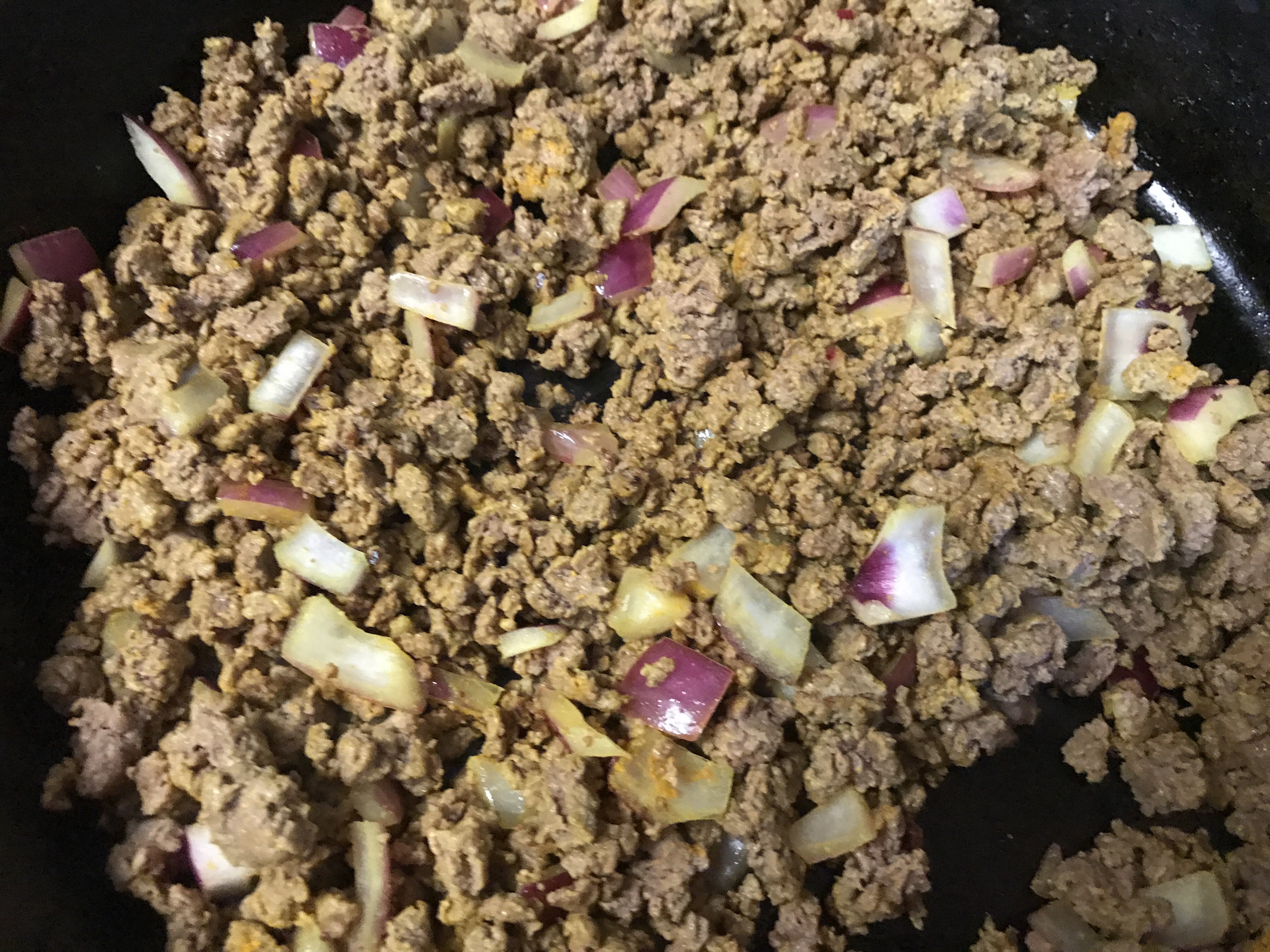 In a large skillet, heat the other 1 Tbsp oil. Add the soy granules and onions and cook for about 5 minutes.