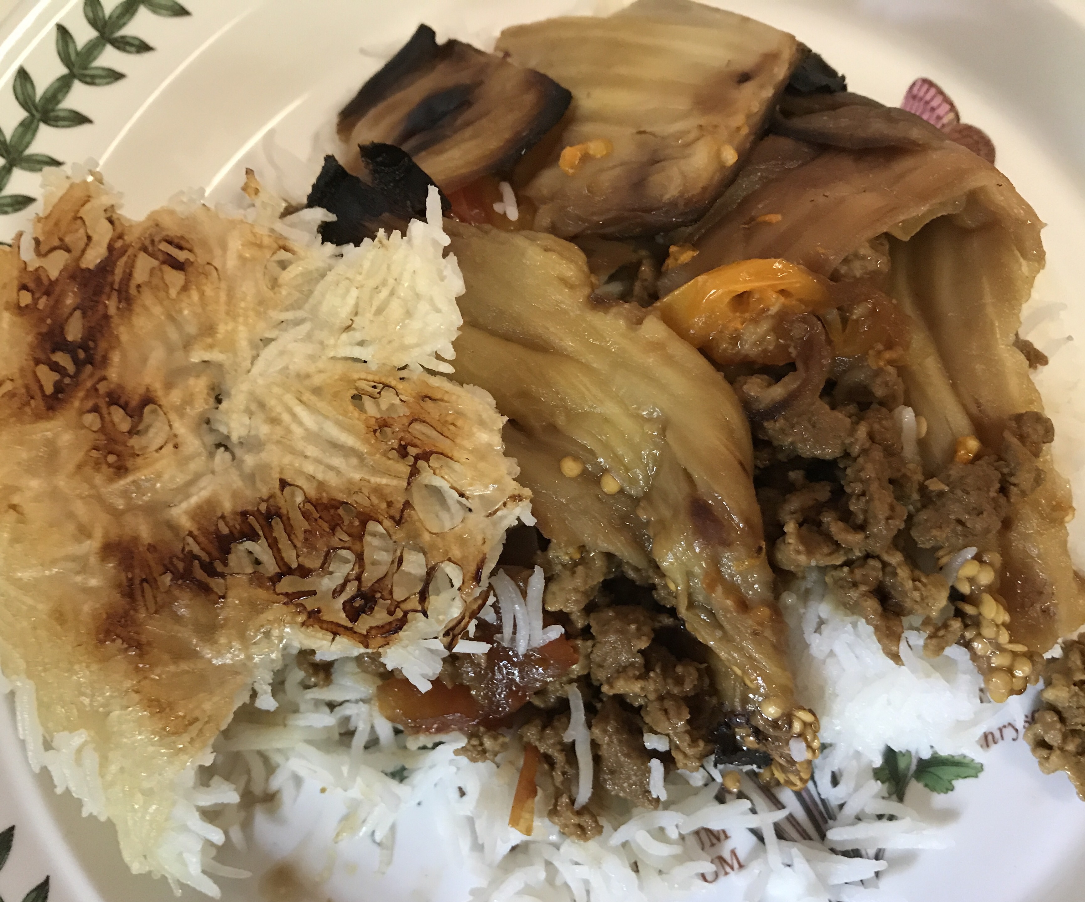 So we are “eggplanting” it out this week. My vegetarian daughter is home so, I created this version of khoresh bademjun for her. Needless to say, she was thrilled.