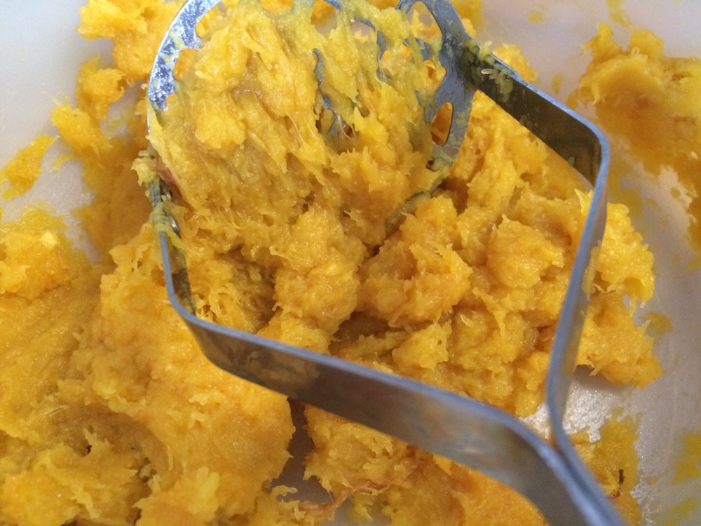 In a large bowl, combine the cooked squash and garlic with the nutmeg, ricotta, and pinenuts. Stir well and taste. Add more salt and pepper if it needs it.