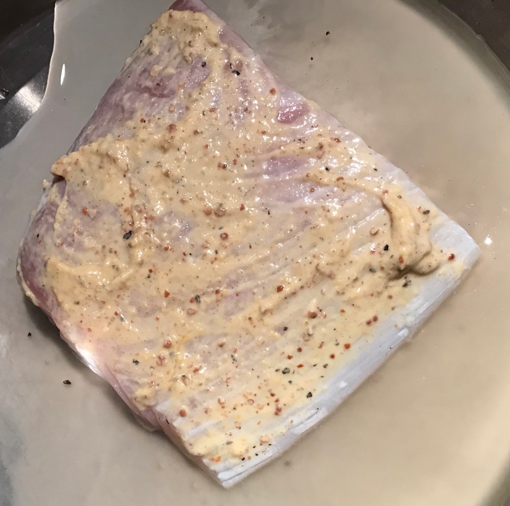 In an ovenproof skillet, pour enough chicken stock to cover the bottom about ¼” deep. Place the halibut in the skillet, squeeze lemon over the fish and season with salt and pepper. Spread a thin layer of mustard on the fish.