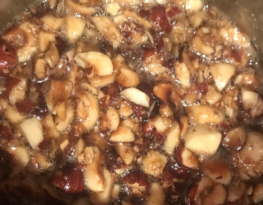 In a medium skillet, saute the nuts until lightly browned. Remove from heat. Add the maple syrup and allow the hot pan and nuts to warm the syrup.