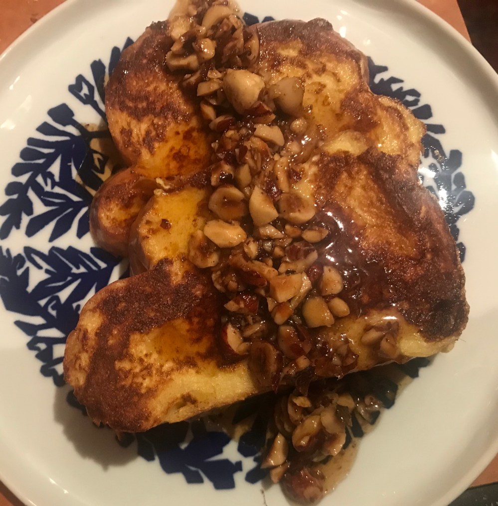 When we came home, I made challah french toast for dinner – I really do love breakfast for dinner. To take advantage of the foods available to us here, I used local hazelnuts to make hazelnut maple syrup to top the pancakes.