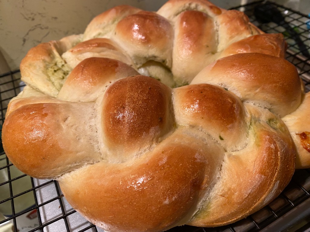 It has been a while since I made a challah stuffed with a liquid-y filling, and I initially forgot to only put a little pesto on the flattened dough rope. What a mess! There was no way that rope was going to close up. I ended up taking some dough from the other ropes, flattening it out and using it to wrap up the first rope. Thus, you can see the extra bread on the right side of the slice above.