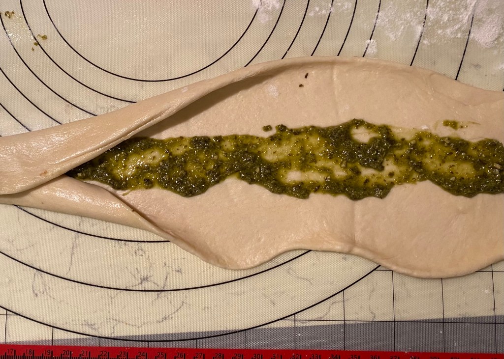 Divide the dough into three equal sections. Roll each into a rope, then flatten to about 3 inches wide. Place the pesto or cheese down the center of the rope and pinch the dough together. Roll the rope back and forth to seal the seam. I filled 2 ropes with pesto, 1 with cheese; you can do any combination, including the pesto and cheese together (if you do that, be especially careful not to use too much pesto, or the rope will not seal).