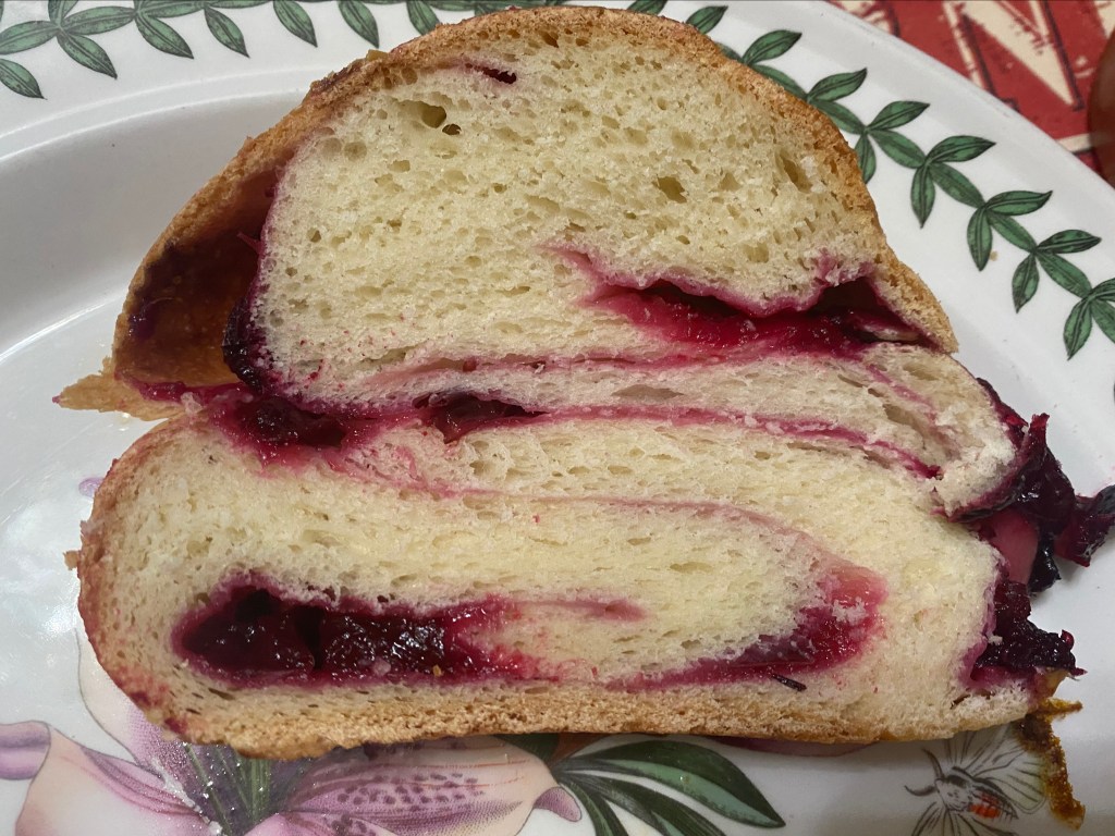 For a single-strand challah braid: Flatten the dough into a rectangle, about 10” x 12” or wider. Spread the cranberry sauce on the dough, leaving a 1” border around the edges. Starting at the long end farthest from you, roll towards you, rolling the dough up like a jelly roll. Pinch the ends and the seam together and roll the rope back and forth to seal the seam and lengthen the rope to about 24” (or longer).