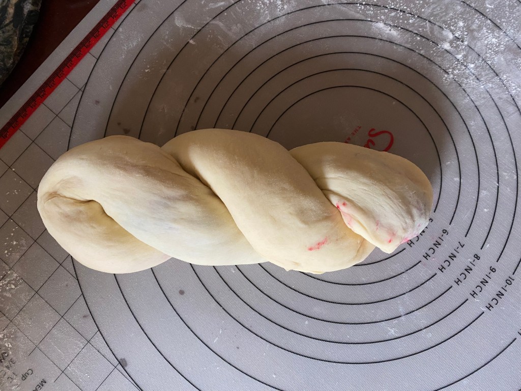 Line a baking sheet with parchment or a silpat liner. To do a single strand braid, fold the strand in half and twist the folded end. Place on the parchment and continue twisting the dough. Pinch and seal the end together and tuck under the braid. Cover and allow to rise an additional 30 minutes.