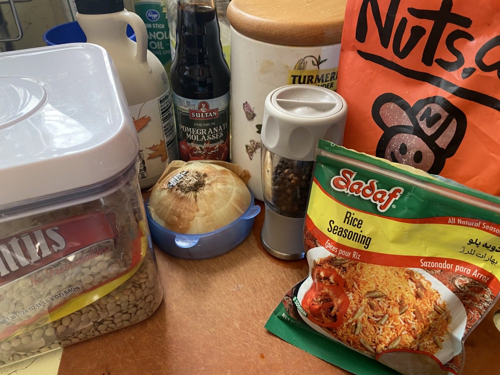 I have been creating so many new recipes, and vegan ones, for my next cookbook, that I needed a break. I made my own vegan version of fesenjan, so I decided to simply try someone else’s. I am writing this as I try it, so, come along with me as I make The Minimalist Baker’s Vegan Lentil Fesenjan. As you may recall, fesenjan is a Persian stew made with walnuts, onions, and pomegranate molasses. Typically, it is made with chicken. My vegan version is made with jackfruit; the recipe will be in the cookbook.