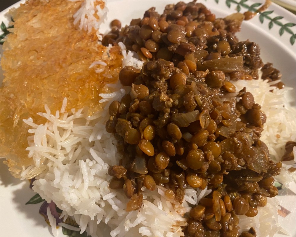 Now, the rice is in the Persian rice cooker, the onions are translucent and I have added salt, pepper, lentils, and vegetable broth. But of course, since I read a recipe and then forget what I just read, I put the lentils in before the broth was boiling. So, I will need to watch the cooking time more carefully (i.e. – they may cook quicker once the broth comes to a boil.