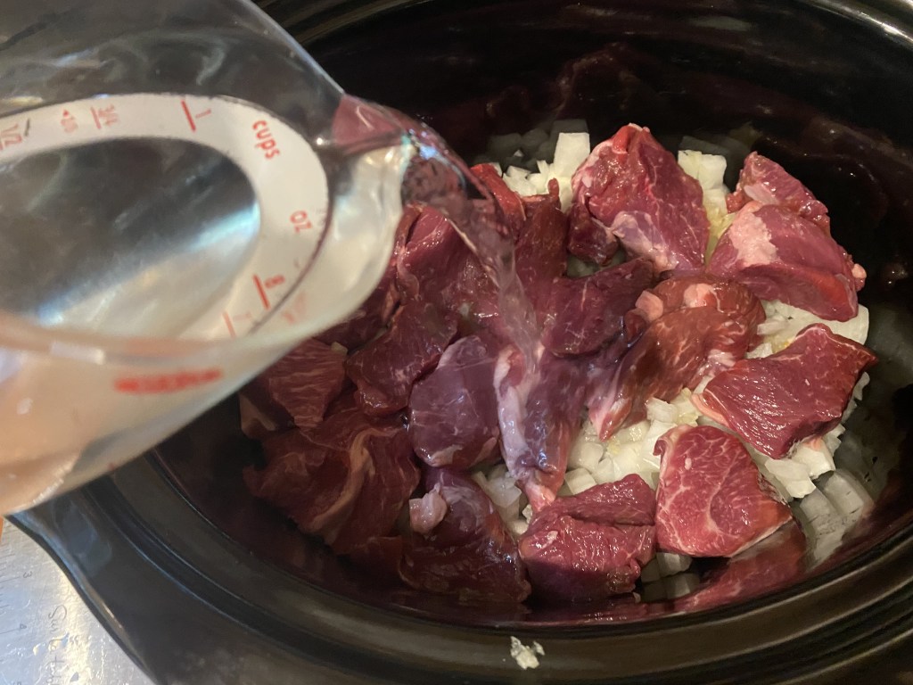 In a large slow cooker, spread the oil over the bottom. Add the onions and garlic in a layer. Top with the protein. Add just enough water to barely cover the protein pieces, they should not be submerged. Cook on low for 4 hours.