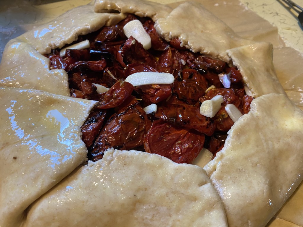 Two and a half pound were set aside to try making Rick Martinez’ roasted tomato galette. It is a bit of a process, so I have started in the morning, when I can get other things done while the tomatoes roast (including writing this blog as I go). They looked so beautiful, topped with thyme from my “garden”, going into the oven.