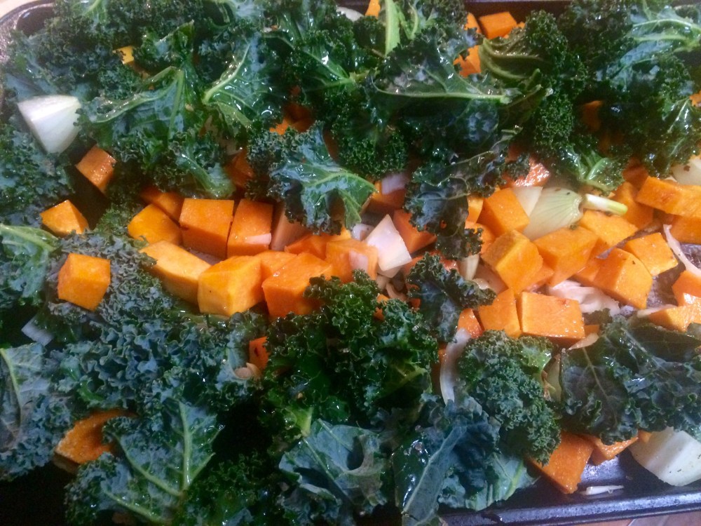 Spread the vegetables in a single layer on a baking sheet. (For ease later, separate the kale on one side).