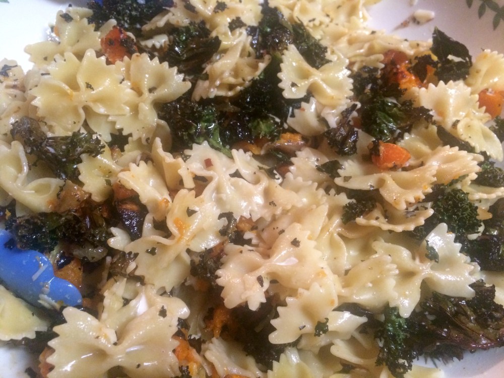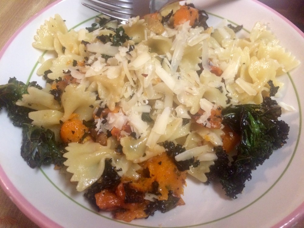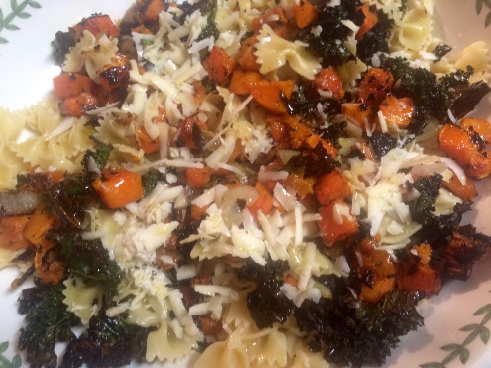 Adapted from The Splendid Table’s Sweet Roaster Butternut Squash and Greens Over Bow-Tie Pasta.