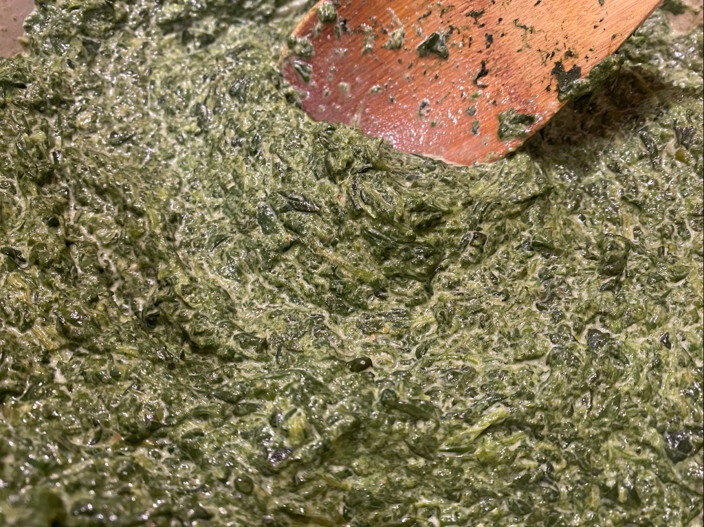 The sides were new trials. Creamed spinach from the same Monday Morning Cooking Club book and a yapsuk – a Polish potato dish from the Jewish Food Society’s website. Both were really tasty. The yapsuk had a crispy outside and a soft, creamy inside, almost like a really thick, back latke. The creamed spinach was especially good spread on top of the bread.