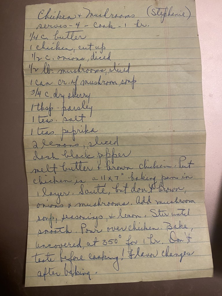 As you can see, this recipe is from Stephanie, my sister-in-law. I can definitely date this to the 1970’s since I remember eating it (or not eating it, as the case usually was, I was the world’s pickiest eater until my 20’s). So, I remember it being served, let’s put it that way. My mom always liked Stephanie’s cooking.