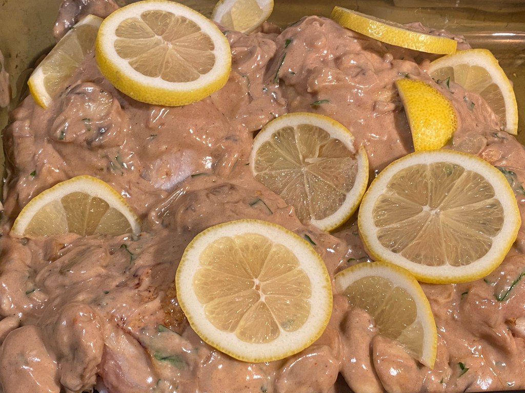 In making the dish I reduced the butter (vegan) to 2 tablespoons, one when browning the chicken, the other before adding the onions and mushrooms. I also place the lemons on top before baking, rather than mix them into the sauce; no real reason for that, it just seemed like the right approach. I do want to note that the lemons are really important to the overall flavor of the dish.