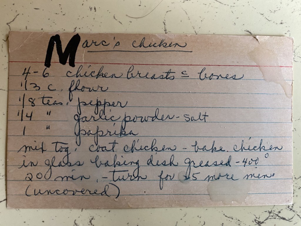 Here is a straightforward recipe that took me awhile to figure out my mom’s shorthand. Was that chicken breasts with bone or without. I would guess without, but 45 minutes of cooking made me think with. Looking at the recipe, I think it would be better boneless, and even better with the breast cutlets pounded to ½ inch, so that’s what I did. But it meant watching the time, they would cook faster.