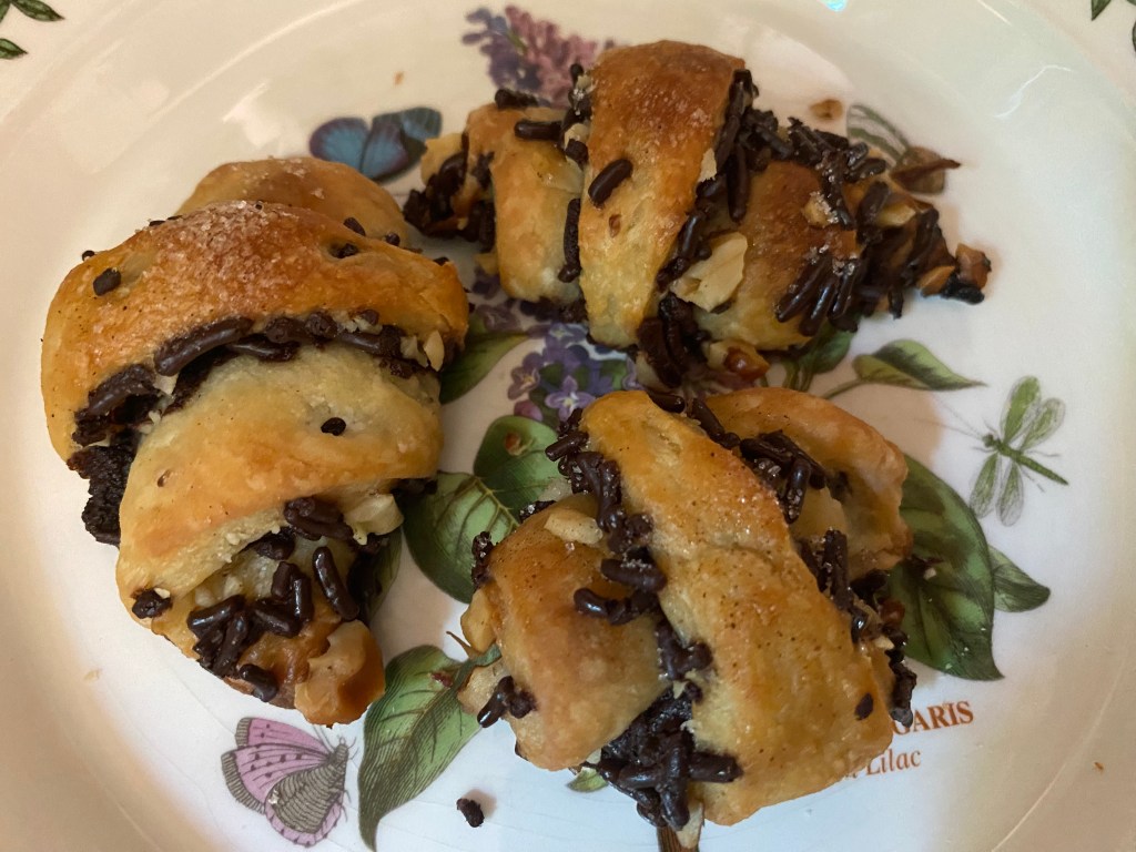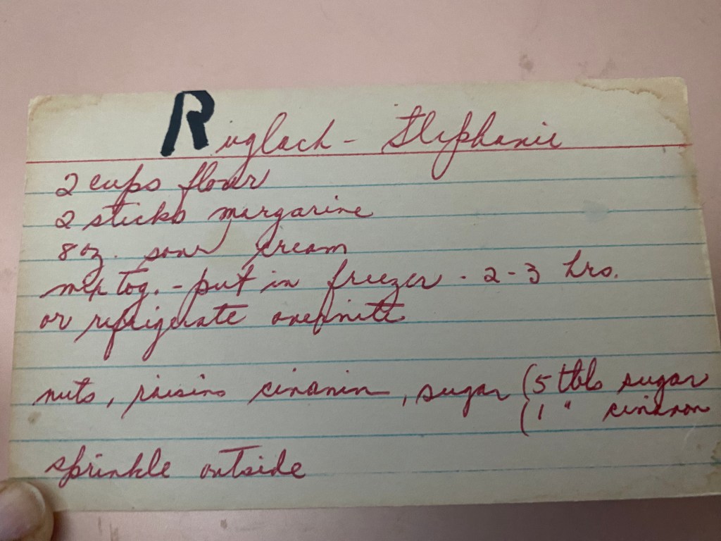 Shavuot is coming up this week, and I associate rugelach with Shavuot. And…I found a rugelach recipe in my Mom’s recipe box. I have already shared my Aunt Gussie’s rugelach and my pistachio Persian rugelach, now I’ll share a version of my sister-in-law Stephanie’s rugelach. I say, “a version” for a few reasons: 1 – this is all the recipe card had – the ingredients;
