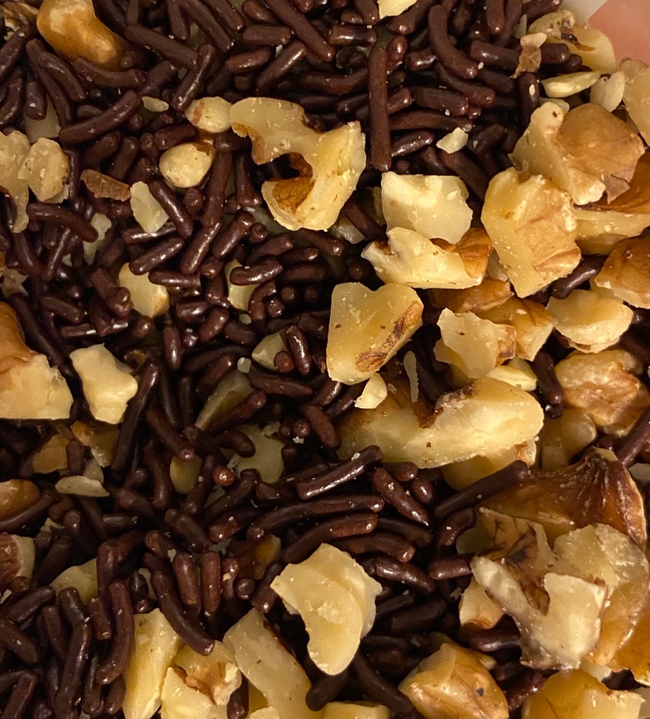 That was the big decision; what should the filling be? I decided on using the chocolate sprinkles I brought back from Amsterdam. I absolutely love these sprinkles and I thought they would hold up well in baking, so I chopped up about a cup of walnuts, then kept adding sprinkles until I thought the balance between the two was right.