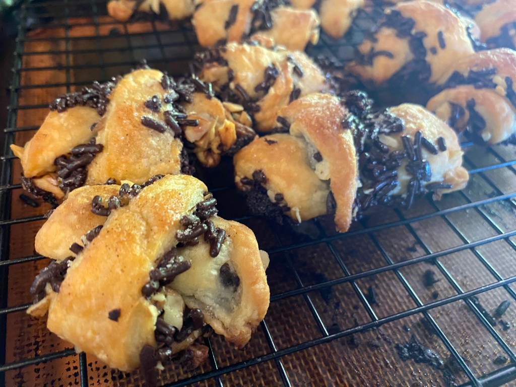 I mixed the dough in my standing mixer, wrapped it in plastic wrap, and put it in the fridge overnight. It was quite sticky so I used a generous amount of flour on the table and rolling pin. I rolled it out into a large thin (about ¼”) circle. I spread the topping generously over the entire circle and cut it into 16 wedges. I rolled eat one up, starting from the outside edge of the circle and placed them on a line baking sheet. I sprinkled the tops with the cinnamon sugar. Baked them at 350F for 35-40 minutes, til they looked nicely golden and cooked through.